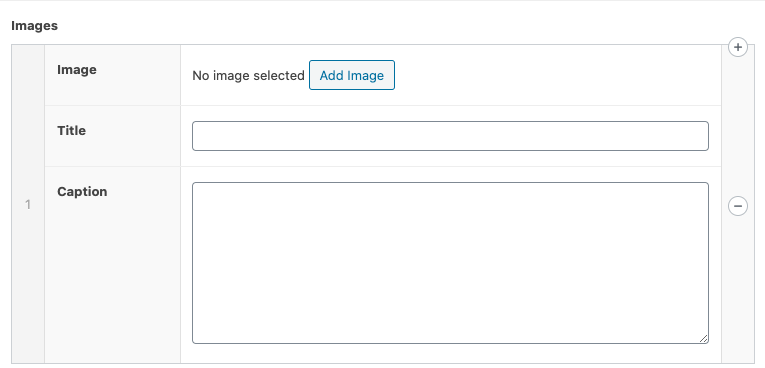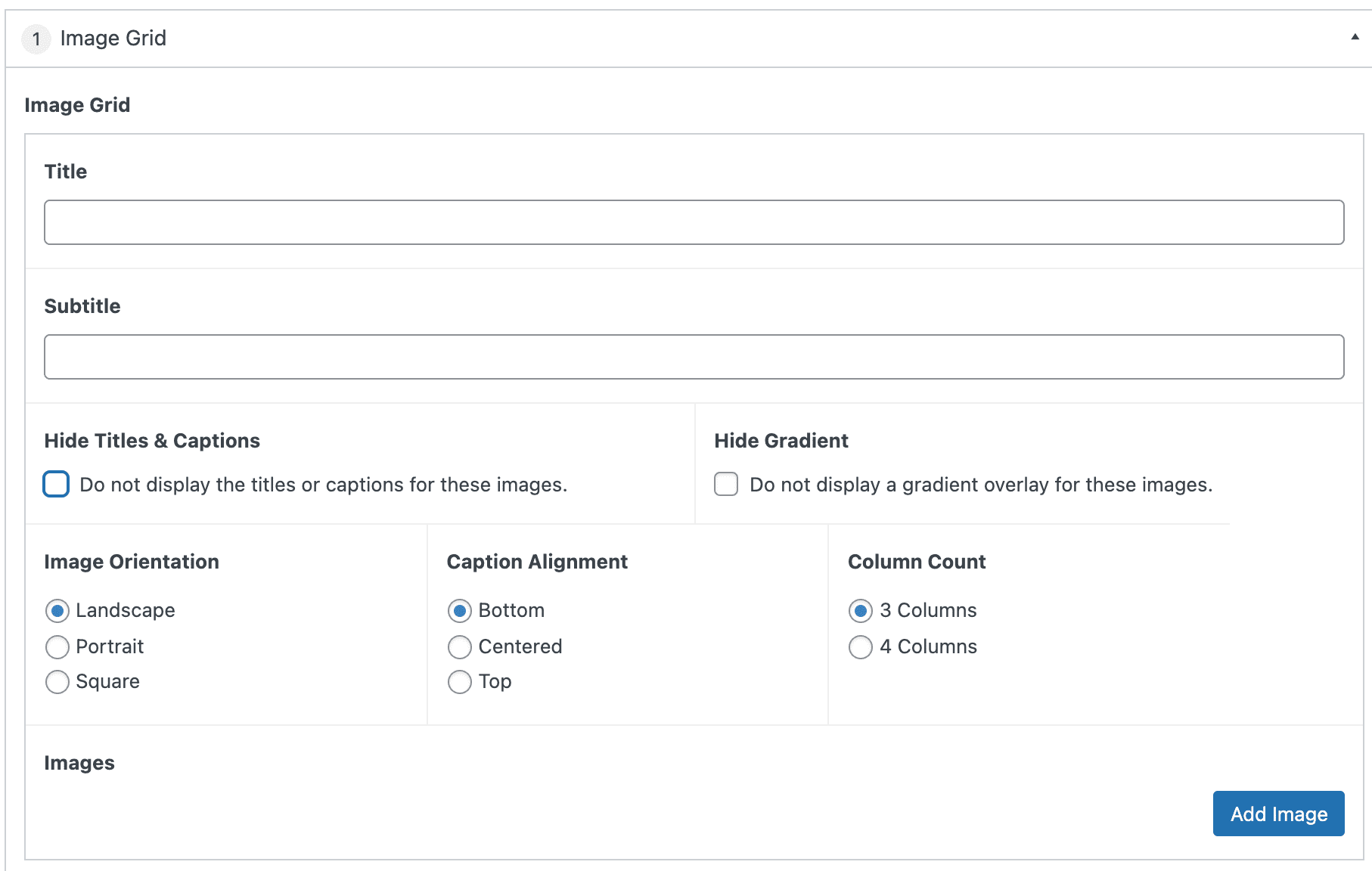 Select the “Add Row” button to add images to the grid. Title and Caption fields are optional.