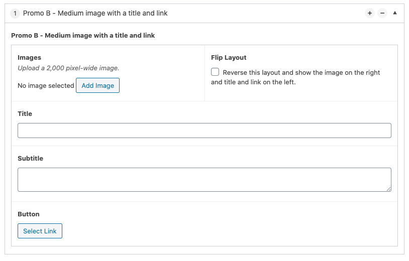 The Promo B component provides medium sized display to highlight a piece of content. The component will grow in height depending on the length of the Title and Subtitle provided (and crop the image accordingly).