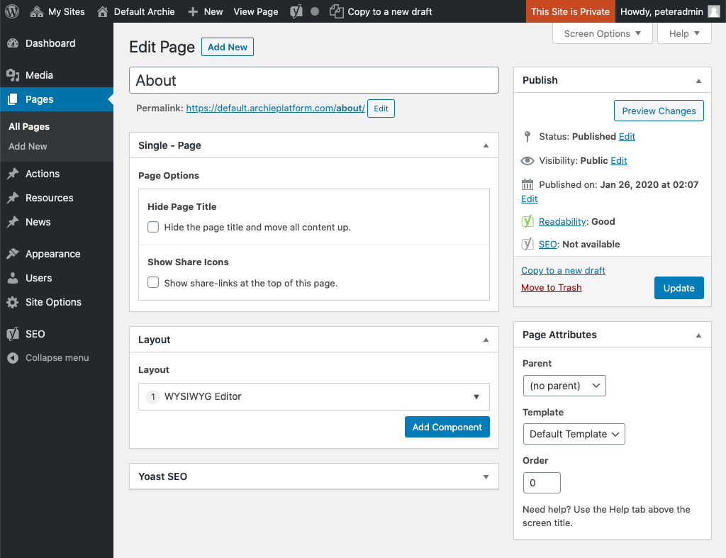 Provide a name for your page or edit and existing name. When adding a page title for the first time, the permalink will automatically be generated. The permalink is the actual URL that will be used to access the page.