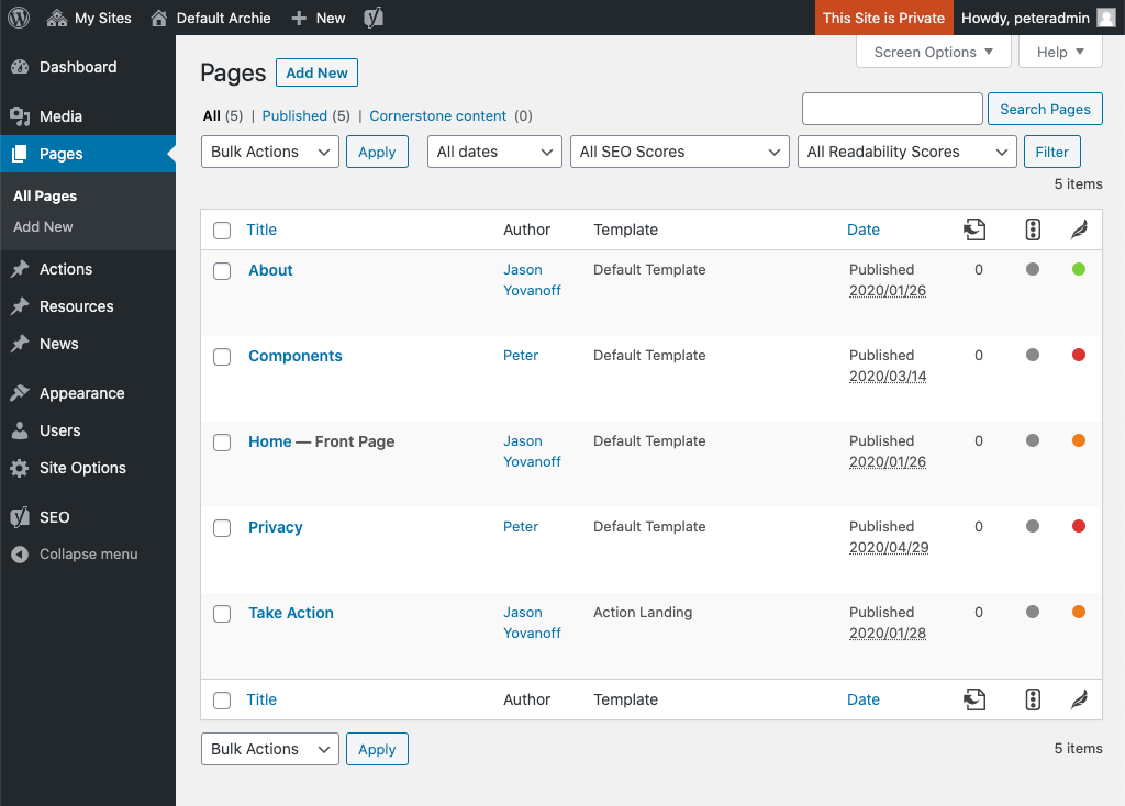 The Pages section contains all the static pages of your site. From here, you can create new pages, remove pages or edit existing pages.
