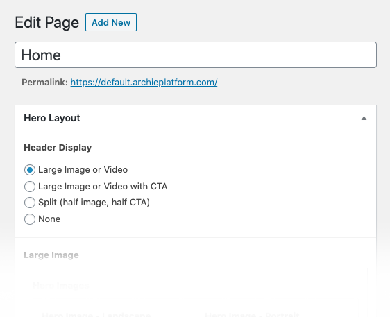 The Home page is a unique page within the Pages section that contains a bit more features and customization. It is denoted in the Pages list with “—Front Page”. The Home page contains an extra set of options located under the page title in the “Hero Layout” area of the admin workspace.